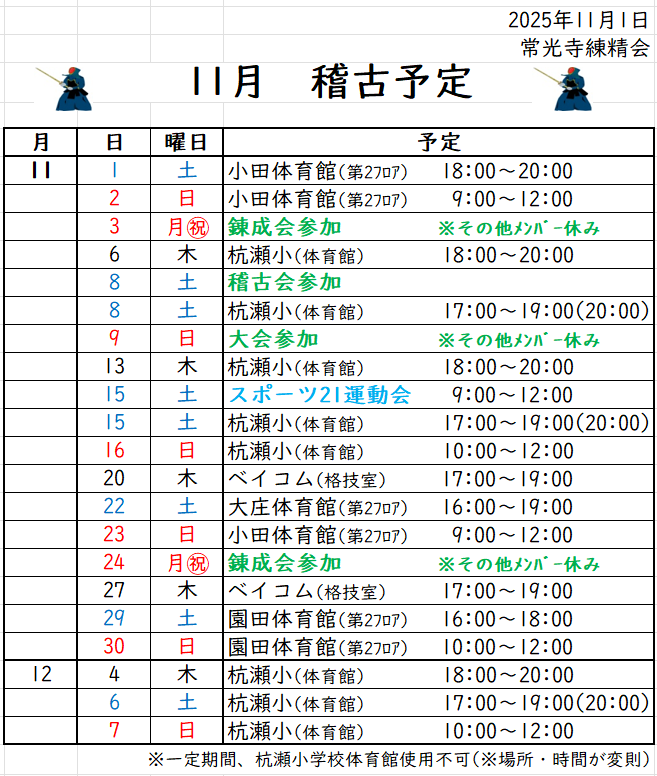 | 活動時間 | 木 18:00~20:00 土 17:00~20:00(小学生は19:00まで) 日 10:00~12:00 ※行事・大会により変更となる場合もございます。 |