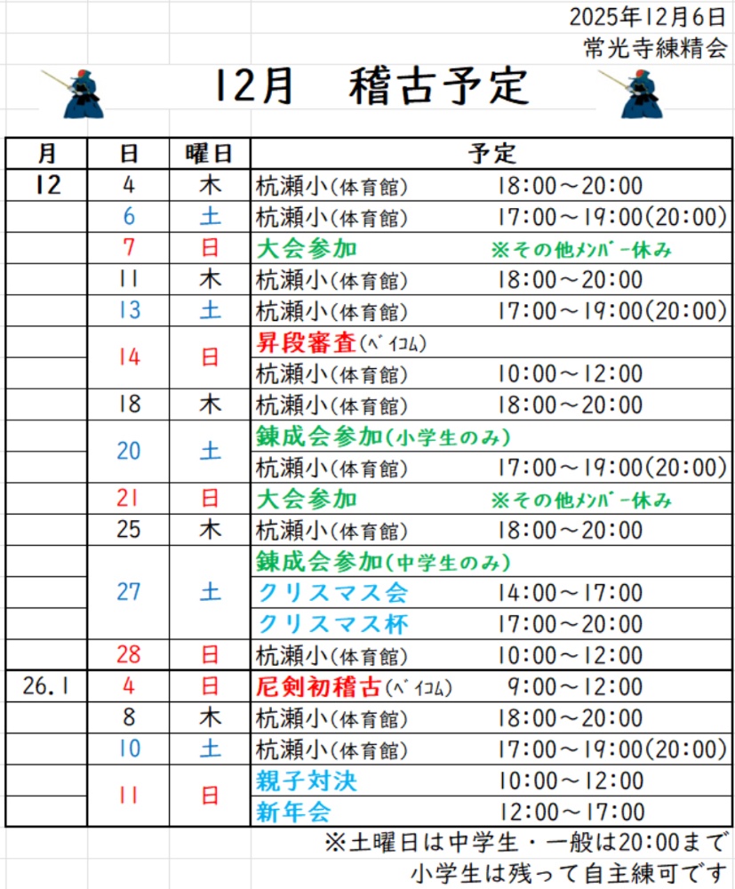 | 一言 | 只今、会員募集中です!! 見学・体験いつでもお待ちしています。 練成会などのお誘いもお待ちしています。 一緒に剣道を楽しみましょう。 お気軽にお問い合わせください。 Mail:jyoukouji.renseikai@gmail.com |